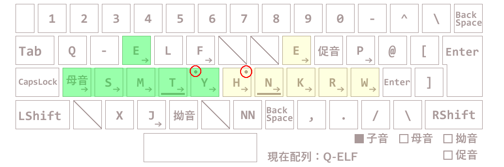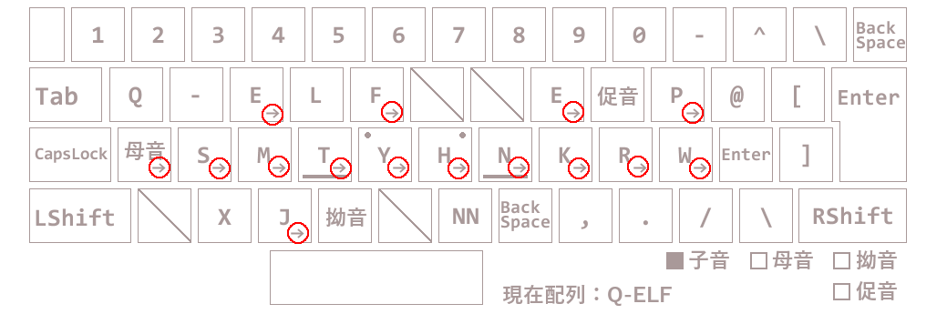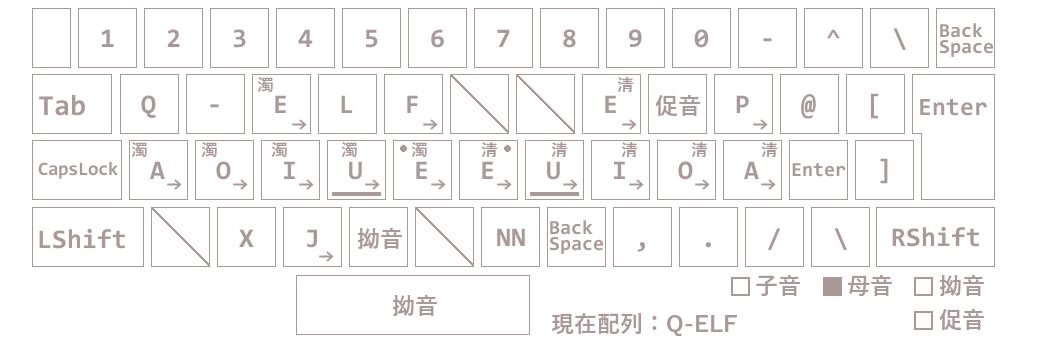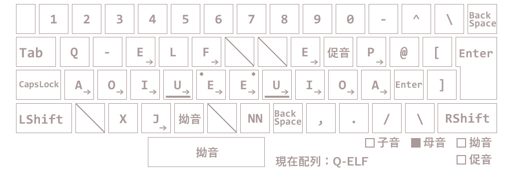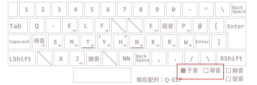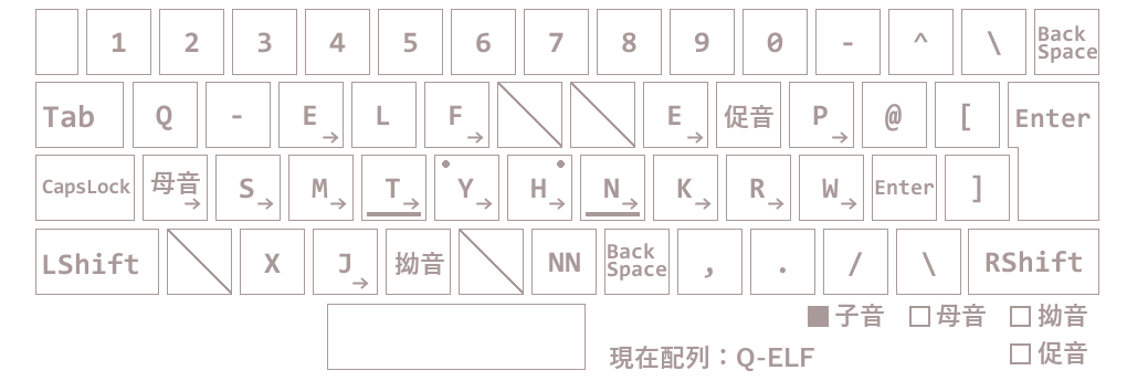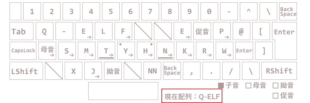 - Q-ELF配列時,QWERTY配列時におけるMℹ️Q-ELF配列時におけるBackSpaceを一意に特定出来るようにする為の言い回しです。を押すと,様々な状態がリセットされます。(その時母音配列ならば子音配列になるみたいな)